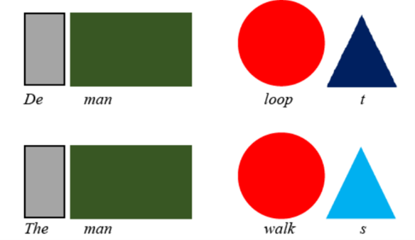 Daarbij gebruiken de lessen taalsymbolen in verschillende vormen en kleuren. Er zijn vormpjes voor woordsoorten, maar ook voor uitgangen. Dit is geïllustreerd in het voorbeeld hieronder. Deze vormpjes worden geplakt op twee verschillende klittenbandstroken: een witte voor het Nederlands, en een zwarte voor het Engels. De stroken worden onder elkaar gelegd en vergeleken. Zo komen kinderen erachter hoe de zinsstructuren in het Nederlands en het Engels op elkaar lijken (maar ook dat er soms belangrijke verschillen zijn).